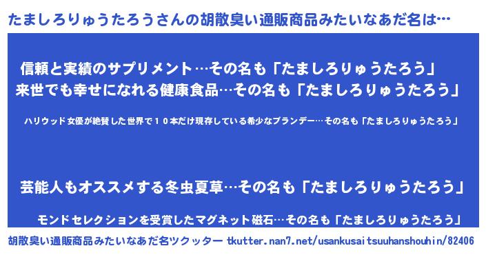| 意味不明あだ名 | 『住所不定無職たましろりゅうたろう(89歳)』 |