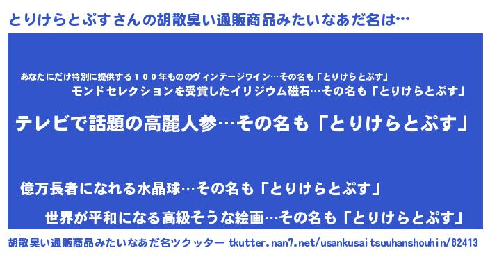 | 意味不明あだ名 | 『自称とりけらとぷす』 |