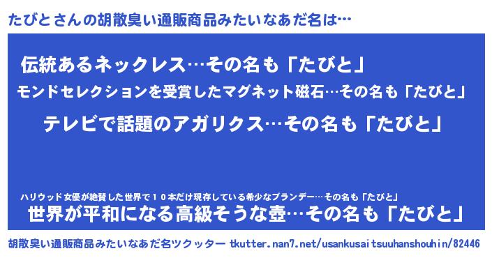 | 欧米人風あだ名 | 『アンジェラ・たびと』『ウサインたびと』 |