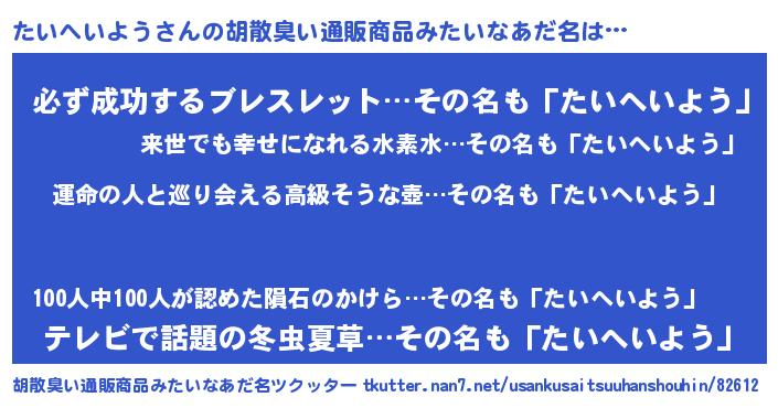 | 男性向けラノベタイトル風あだ名 | 『たいへいように滅ぼされるだけの簡単なお仕事です』 |