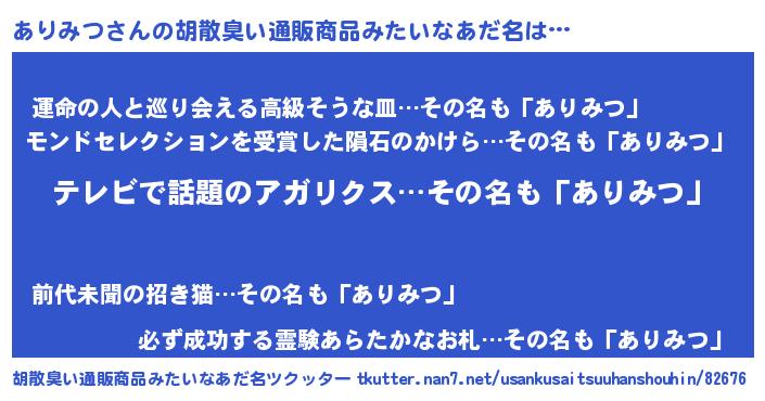 | ヘコむあだ名 | 『豆乳』『ありもー』『ありみつ(笑)』 |