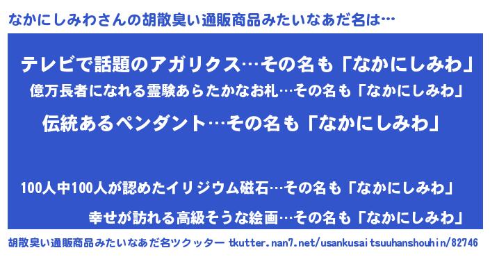 | 男性向けラノベタイトル風あだ名 | 『転生したらなかにしみわだった件』 |