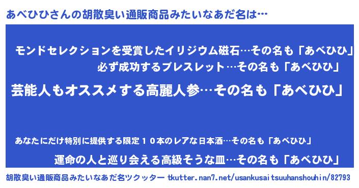| 意味不明あだ名 | 『自称あべひひ』『しいたけ科あべひひ属』 |