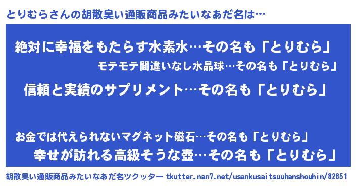 | 意味不明あだ名 | 『とにかく怪しいとりむら』 |