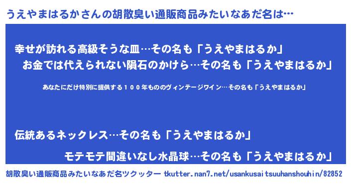 | 男性向けラノベタイトル風あだ名 | 『うえやまはるか~年齢イコール彼女いない歴の魔法使い~』 |