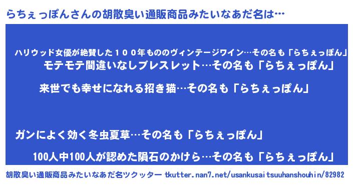 | 意味不明あだ名 | 『永久保存らちぇっぽん』 |