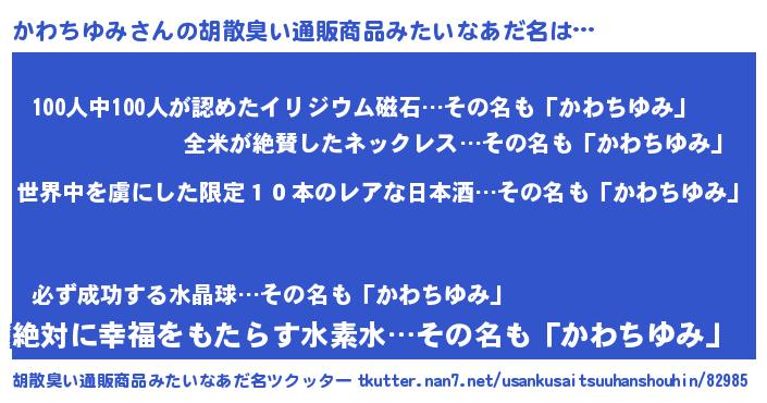 | ヘコむあだ名 | 『かわちゆみ(爆)』『かわっぺ』 |