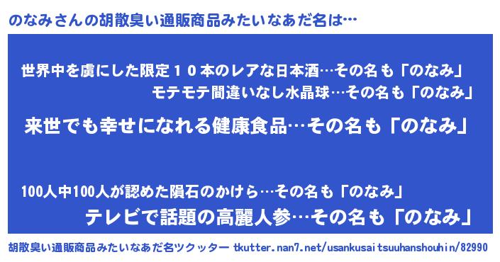 | ヘコむあだ名 | 『のなみ(苦笑)』『のなもー』『豆乳』 |