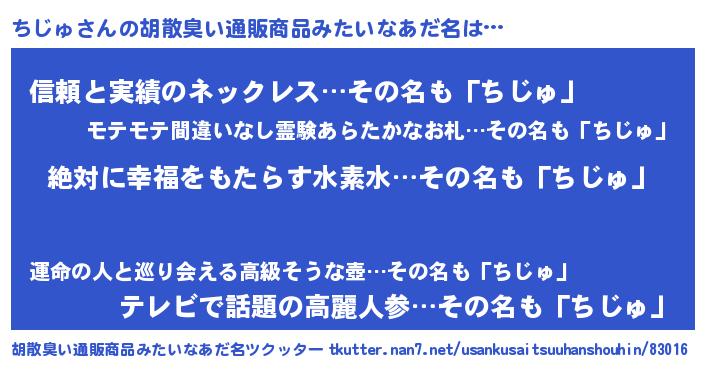 | 男性向けラノベタイトル風あだ名 | 『ちじゅという概念が存在しない退屈な世界 』 |