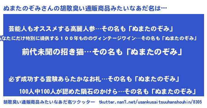 | 意味不明あだ名 | 『永久保存ぬまたのぞみ』 |