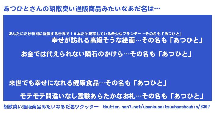 | 男性向けラノベタイトル風あだ名 | 『ノーゲーム・ノーアツヒト』 |