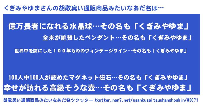 | 意味不明あだ名 | 『住所不定無職くぎみやゆま(4歳)』 |
