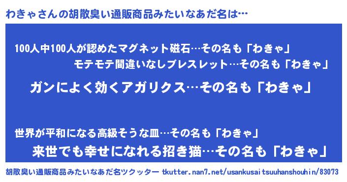 | 男性向けラノベタイトル風あだ名 | 『はたらくわきゃさま!』『緋弾のワキャ』 |