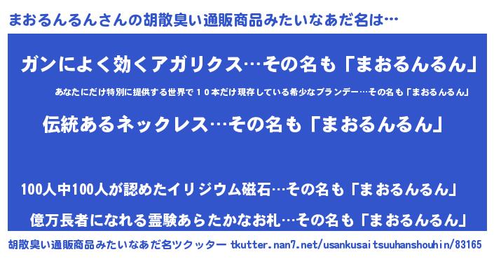 | 男性向けラノベタイトル風あだ名 | 『まおるんるんの嫁は女の子じゃないと思った?』 |