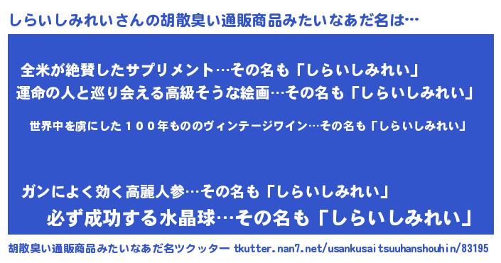 | 意味不明あだ名 | 『住所不定無職しらいしみれい(13歳)』 |