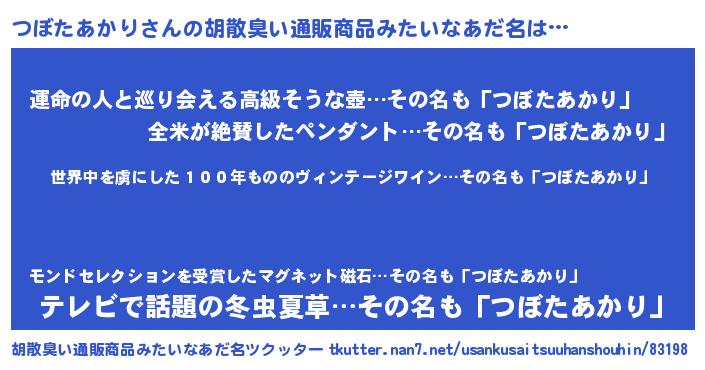 | 男性向けラノベタイトル風あだ名 | 『魔弾の王とつぼたあかり』 |
