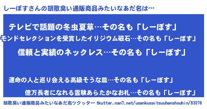 | 欧米人風あだ名 | 『ウサインしーぼす』『マイケルしーぼす』 |