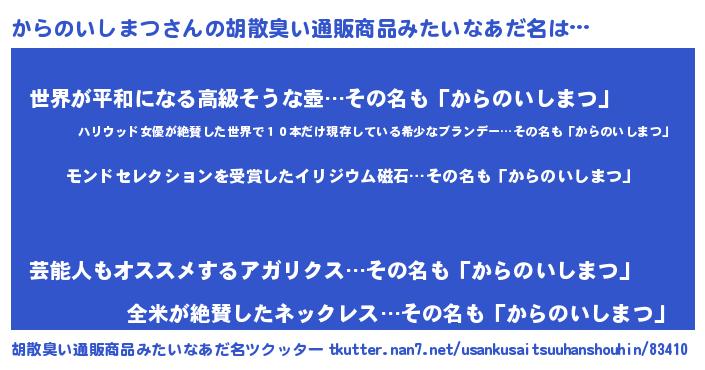 | 男性向けラノベタイトル風あだ名 | 『ノーゲーム・ノーカラノイシマツ』 |