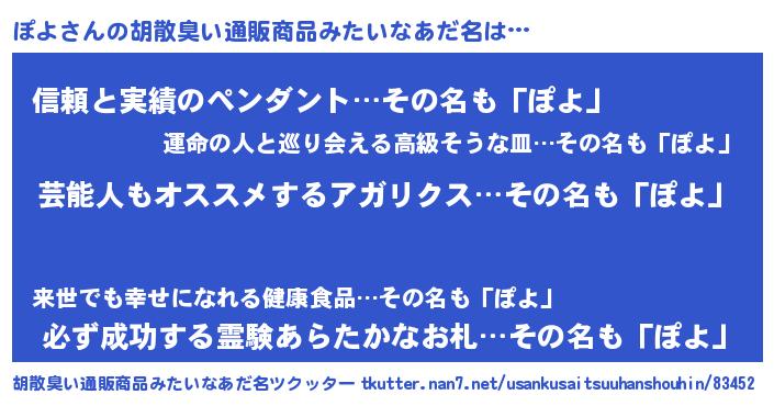 | 男性向けラノベタイトル風あだ名 | 『ぽよ~年齢イコール彼女いない歴の魔法使い~』 |