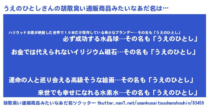 | 男性向けラノベタイトル風あだ名 | 『おまえをオタクにしてやるから、俺をうえのひとしにしてくれ! 』 |