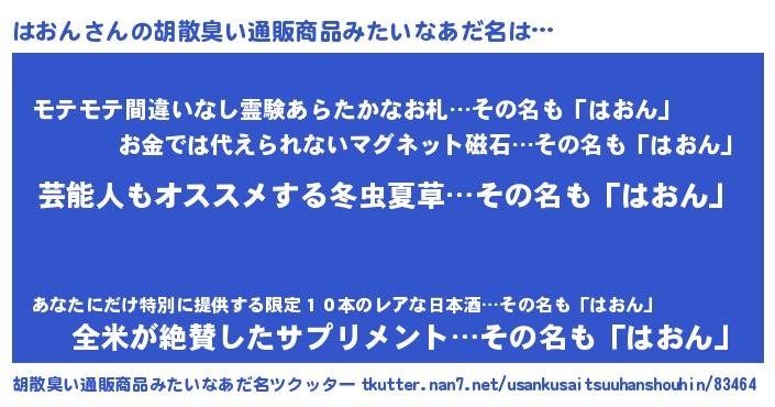 | 男性向けラノベタイトル風あだ名 | 『はおん~年齢イコール彼女いない歴の魔法使い~』 |