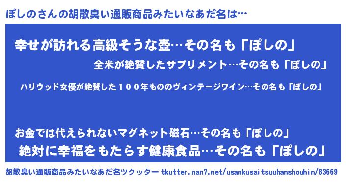 | 男性向けラノベタイトル風あだ名 | 『魔弾の王とぽしの』『ポシノスレイヤー』 |