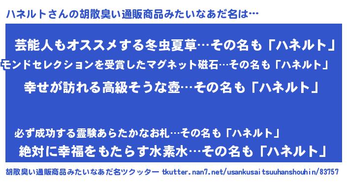| ヒーロー風カッコイイあだ名 | 『ウルトラハネルトマン』『ネオハネルト』 |