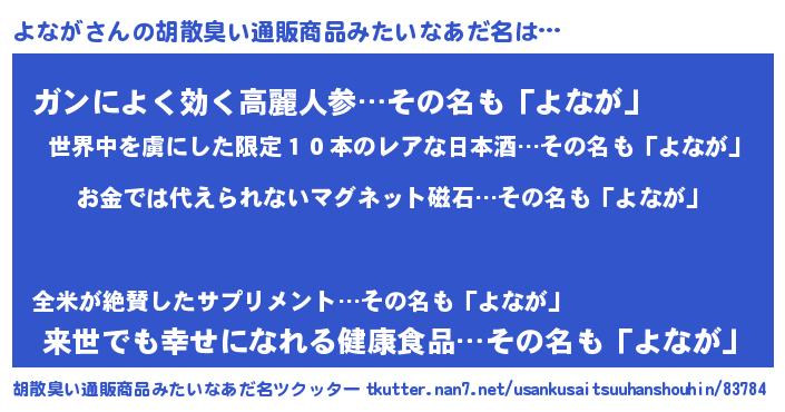 | 欧米人風あだ名 | 『ダニエルよなが』『ケンブリッジよなが』 |