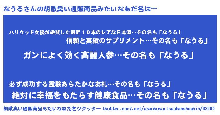 | 意味不明あだ名 | 『自称なうる』『住所不定無職なうる(53歳)』 |