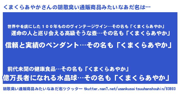 | 意味不明あだ名 | 『とにかく怪しいくまくらあやか』 |