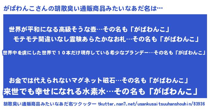 | 意味不明あだ名 | 『住所不定無職がばわんこ(91歳)』 |