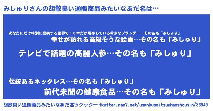 | 意味不明あだ名 | 『自称みしゅり』『永久保存みしゅり』 |