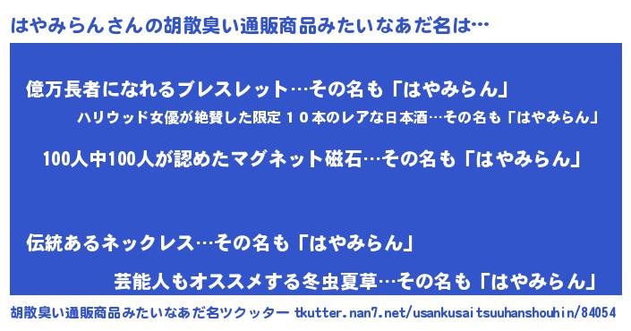 | 男性向けラノベタイトル風あだ名 | 『おまえをオタクにしてやるから、俺をはやみらんにしてくれ! 』 |