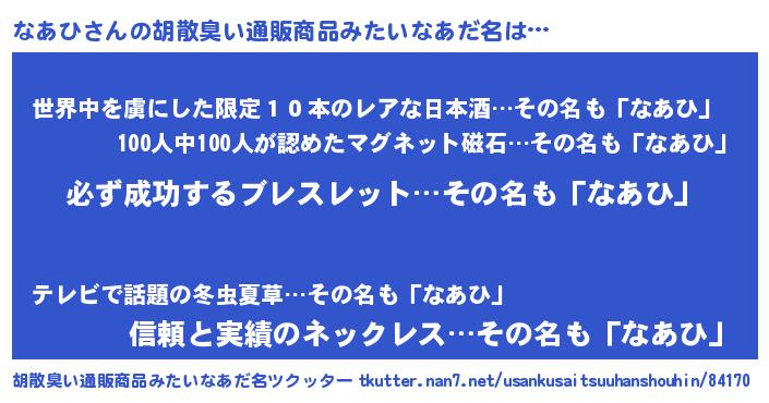 | 欧米人風あだ名 | 『アンジェラ・なあひ』『マイケルなあひ』 |