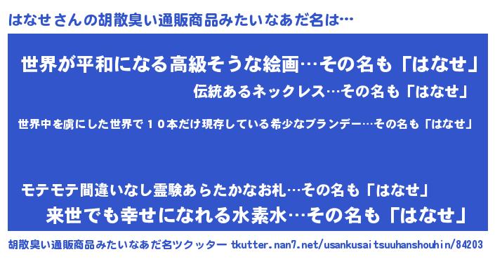 | 意味不明あだ名 | 『住所不定無職はなせ(71歳)』 |