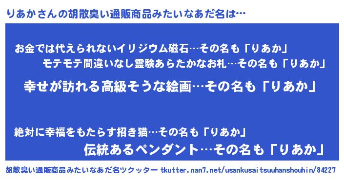 | 女子向けラノベタイトル風あだ名 | 『りあかの雑貨屋さん』『りあか恋絵巻』 |