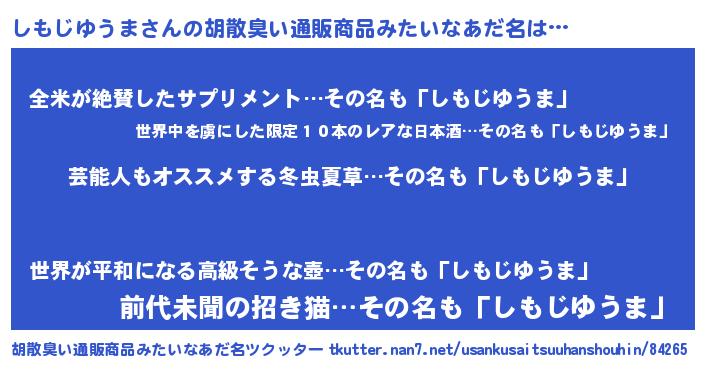 | 男性向けラノベタイトル風あだ名 | 『Re:しもじゆうまから始める異世界生活』 |