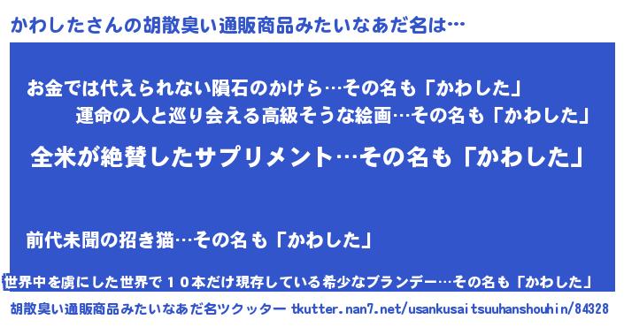 | ヘコむあだ名 | 『かわ太郎』『なまこ酢』『かわもー』 |