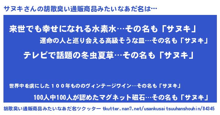 | ヘコむあだ名 | 『サヌキ(震え声)』『豆乳』『サヌを』 |