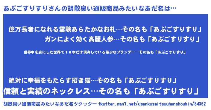 | 男性向けラノベタイトル風あだ名 | 『この素晴らしい世界にあぶごすりすりを!』 |