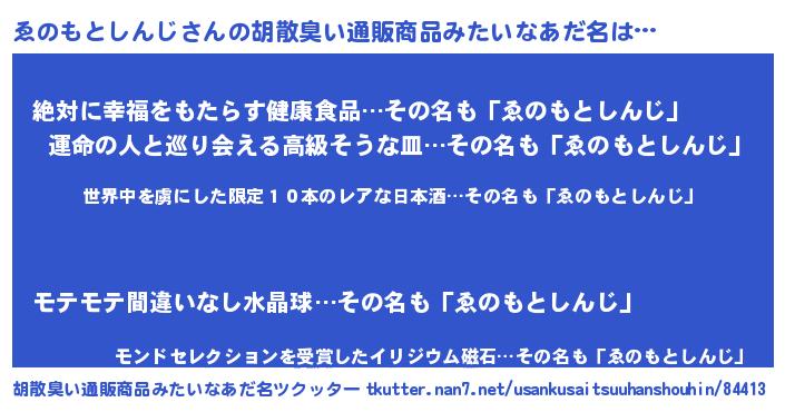 | 意味不明あだ名 | 『住所不定無職ゑのもとしんじ(43歳)』 |