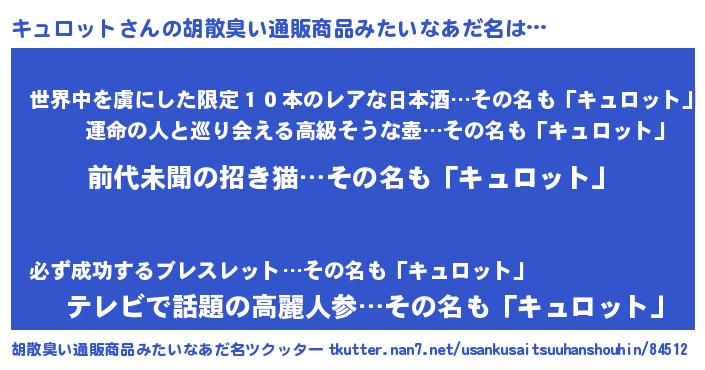 | ヘコむあだ名 | 『キュロット(笑)』『なまこ酢』 |