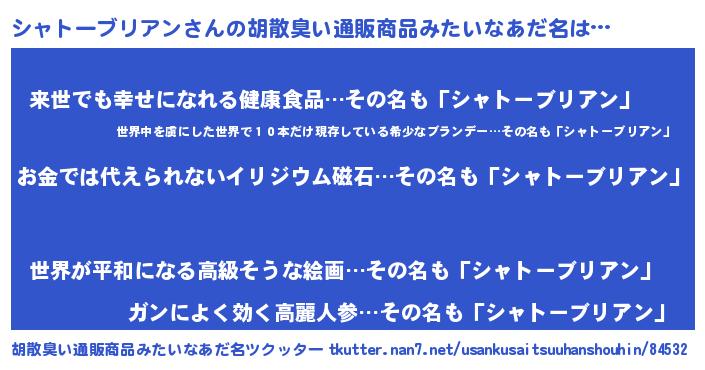 | 男性向けラノベタイトル風あだ名 | 『ノーゲーム・ノーシャトーブリアン』 |