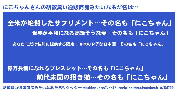 | 意味不明あだ名 | 『住所不定無職にこちゃん(50歳)』 |