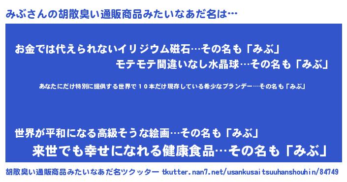 | 意味不明あだ名 | 『ニラ科みぶ属』『住所不定無職みぶ(98歳)』 |