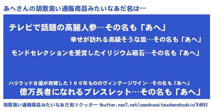 | ヒーロー風カッコイイあだ名 | 『慈愛の使者あへ』『最強戦士アヘ』 |