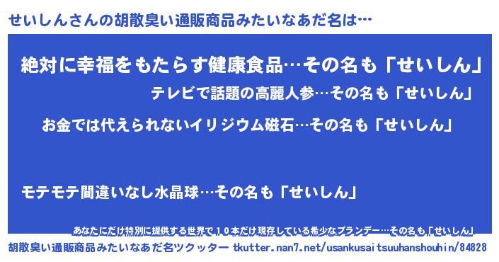 | ヒーロー風カッコイイあだ名 | 『慈愛の使者せいしん』『ネオセイシン』 |