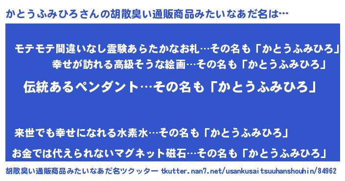 | 男性向けラノベタイトル風あだ名 | 『かとうふみひろの嫁は女の子じゃないと思った?』 |