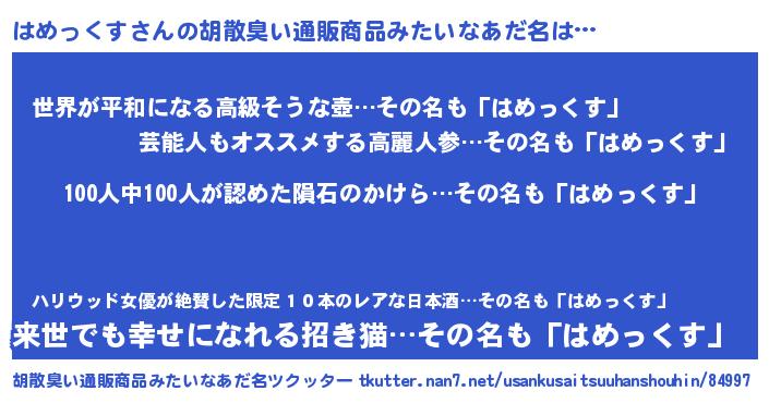 | ヒーロー風カッコイイあだ名 | 『正義の使者はめっくす』『仮面ハメダー』 |