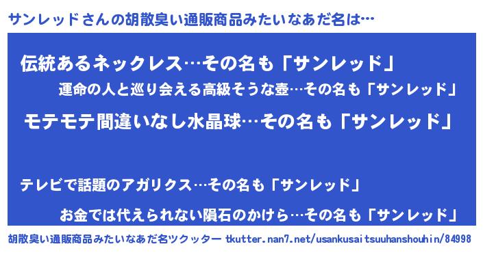 | 男性向けラノベタイトル風あだ名 | 『サンレッドに滅ぼされるだけの簡単なお仕事です』 |
